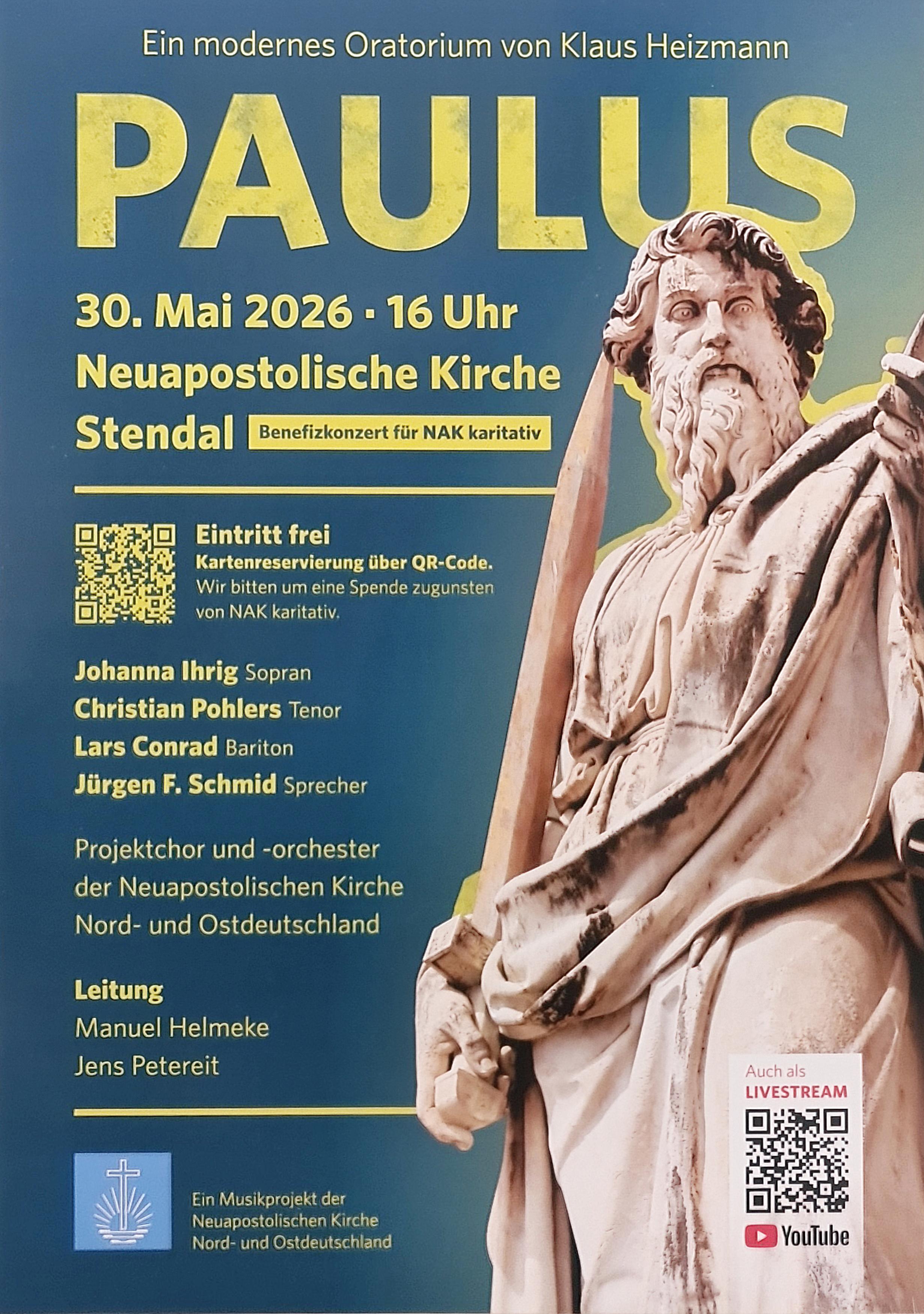 Nach drei erfolgreichen Aufführungen im Jahr 2025 in Leipzig, Braunschweig und Brandenburg kommt es 2026 zu einer Neuauflage mit Konzerten in Stendal und Erfurt. Ein kraftvoll klingender Projektchor aus 120 Stimmen, ein facettenreich besetztes Orchester und professionelle Solisten werden das moderne Paulus-Oratorium erneut zur Aufführung bringen. Die musikalische Leitung liegt bei Manuel Helmeke und Jens Petereit.